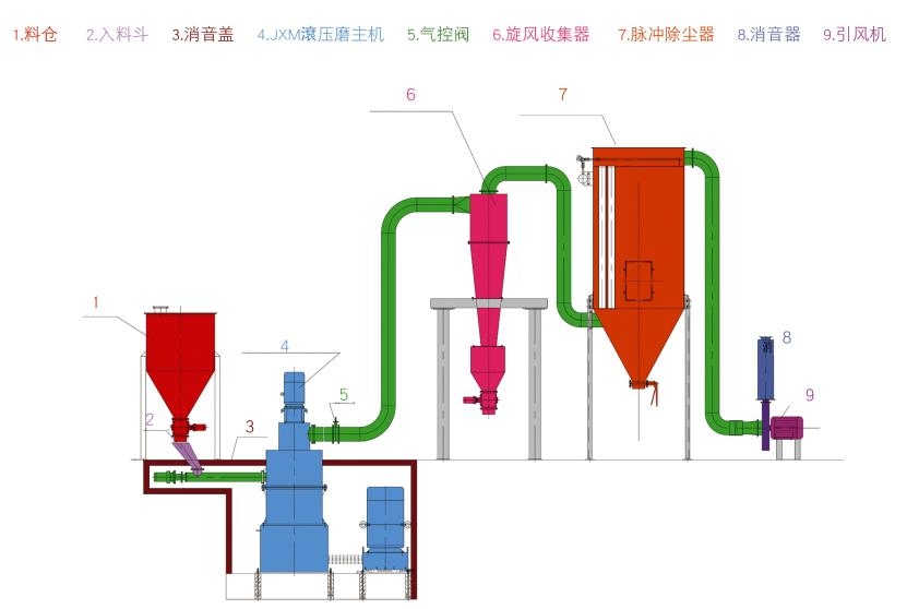 JXM環(huán)輥微粉磨(中速微粉磨)全套設(shè)備包括:錘式破碎機(jī)、斗式提升機(jī)、儲(chǔ)料倉、電磁振動(dòng)給料機(jī)、主機(jī)、選粉機(jī)、擴(kuò)散式雙旋風(fēng)集粉器、脈沖式除塵器、高壓風(fēng)機(jī)、消聲器。主機(jī)電動(dòng)機(jī)通過減速機(jī)帶動(dòng)主軸及各層轉(zhuǎn)盤旋轉(zhuǎn),轉(zhuǎn)盤通過柱銷帶動(dòng)幾十個(gè)環(huán)輥在磨環(huán)滾道內(nèi)滾動(dòng)并旋轉(zhuǎn)。大塊物料經(jīng)破碎機(jī)破碎成小顆粒后由提升機(jī)送入儲(chǔ)料倉,電磁振動(dòng)給料機(jī)將物料均勻的送到上轉(zhuǎn)盤的中部,物料在離心力的作用下散向圓周邊,并落入磨環(huán)的滾道內(nèi)被環(huán)輥沖壓、滾碾、研磨而粉碎,物料經(jīng)第 一層粉碎后又落入第二層及第三層,高壓離心風(fēng)機(jī)的抽吸作用將外部空氣吸入機(jī)內(nèi),并將經(jīng)過第三層粉碎后的粗粉帶入選粉機(jī)內(nèi)。選粉機(jī)內(nèi)旋轉(zhuǎn)的渦輪所產(chǎn)生的渦流使粗顆粒物料回落重磨,細(xì)粉則隨氣流進(jìn)入旋風(fēng)集粉器并由其下部的卸料閥排出即為成品,而帶有少量細(xì)粉塵的氣流則經(jīng)過脈沖除塵器凈化后通過風(fēng)機(jī)及消聲器排出。